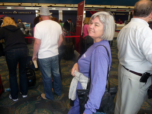 Grudgingly another ticket agent got onto the computer, and issued proper boarding passes. Nancy dashed back to where I was waiting, and with the new documents we were allowed to proceed—to security, where we had to go through all the regular procedures of removing everything from our pockets, taking off our shoes, putting my laptop computer in a separate tray, and so forth. As I gathered up everything, Nancy ran ahead to the gate. As she turned the corner, she heard an agent say “last call for Donald and Nancy Harrison.”