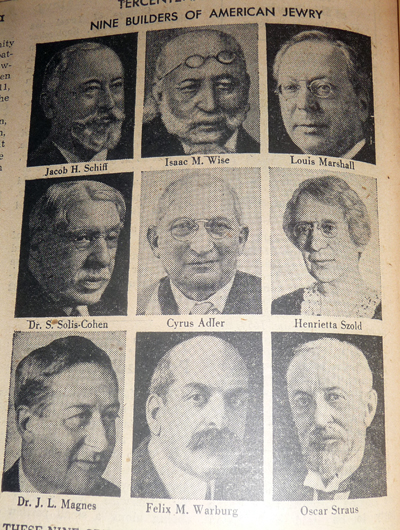 These nine great leaders were among the builders of the American Jewish community and of the Jewish Community Center movement. Mr. Jacob H. Schiff, philanthropist and patron of education, helped found the National Jewish Welfare Board. Rabbgi Isaac M. Wise was the founder of the principal institutions of Reform Judaism. Mr. Louis Marshall was a founder of the Jewish Agency for Palestine and the JWB, and a president of the American Jewish Committee. Dr. S. Solis-Cohen was a noted educator and scholar. Dr. Cyrus Adler was president of the Jewish Theological Seminary of America, eminent scholar and a founder of JWB and other institutions. Miss Henrietta Szold was the founder of Hadassah; Dr. J.L. Magnes was the head of the New York Kehillah and first president of Hebrew University; Mr. Felix M. Warburg, philanthropist, was a founder of the JDC and the JWB; and Mr. Oscar Straus was the first president of the American Jewish Historical Society and first Jew in a President's Cabinet.