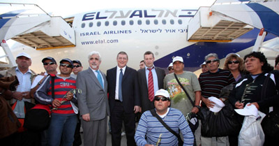 Pictured above: Upon their arrival to the Holy Land this week, 31 Chilean miners were greeted by the Chilean Ambassador to Israel Joaquin Montes (center left), EL AL President Elyezer Shkedy (center) and the Israel Minister of Tourism, Stas Misezhnikov (center right).