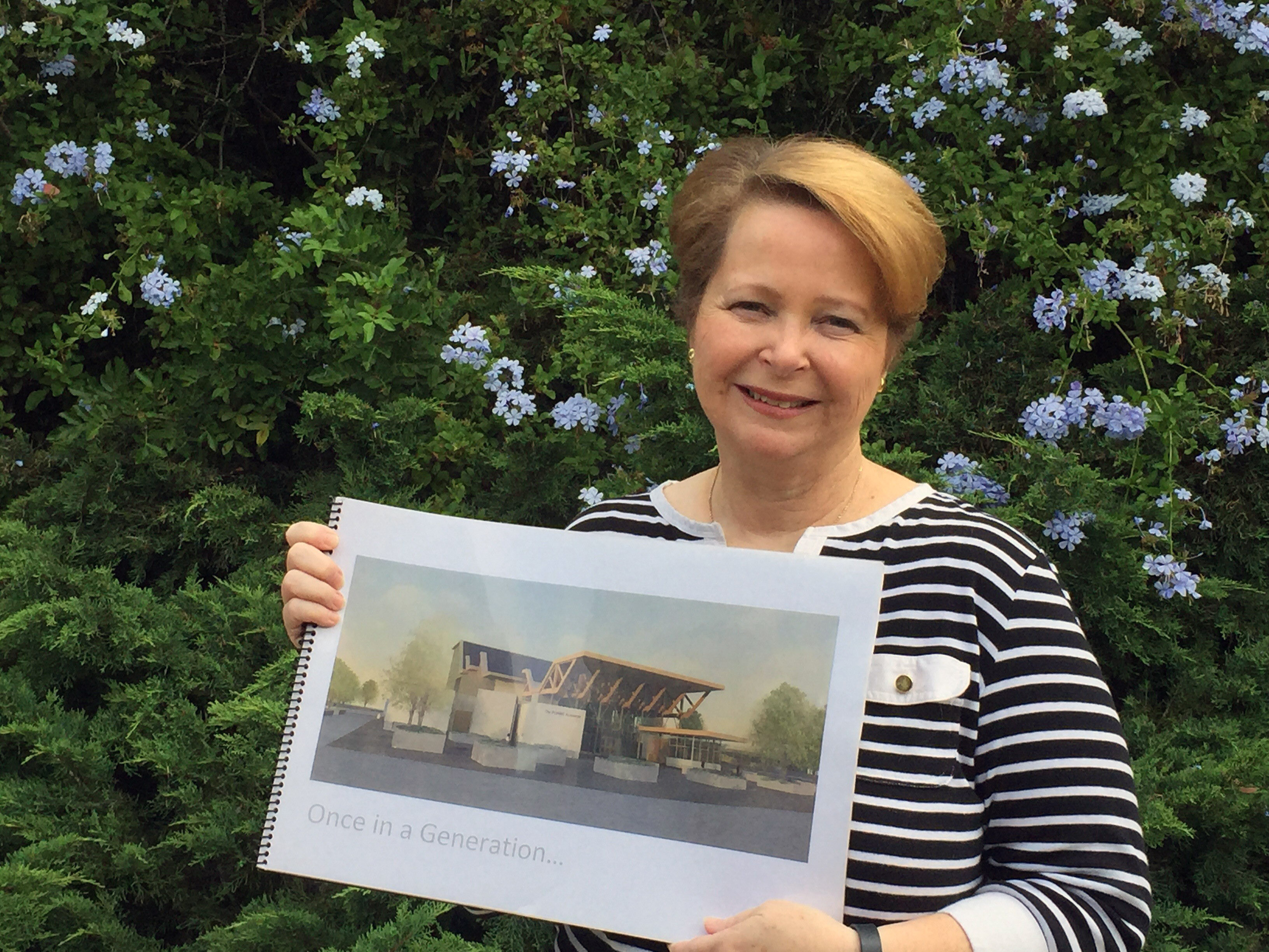 Katherine Nakamura with a rendering of Patrick Henry HS’s new cultural arts facility