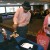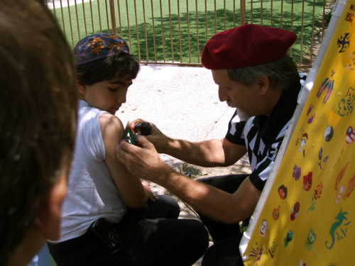 Shor Masori in kippah receives a spray-on tattoo from entertainer in a beret (Photo: Nancy Harrison)