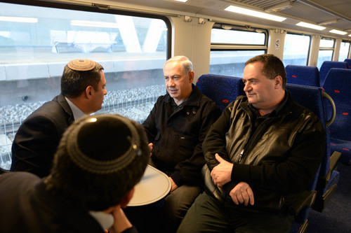 Israeli Prime Minister Benjamin Netanyahu and Israeli Minister of Transportation Yisrael Katz seen aboard a train in the southern Israeli town of Sderot, where they inaugurated a new rocket-proof train station, on Dec. 24, 2013. The new train line connects isolated Negev communities to larger Israeli population centers. Credit: Kobi Gideon/GPO/Flash90.