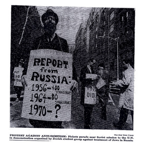 The large photograph and article that appeared in the next day’s New York Times—on page 2, to the students’ great surprise—reveals a lot about the young protesters. They are well-dressed, picketing in calm, orderly fashion, holding placards with well-thought-out slogans. The sign that is most prominent in the photo is remarkably informational: “Report from Russia: 1956 – 400 Synagogues; 1964 – 80 Synagogues – 1970 – ?”