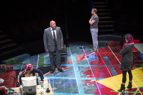 A second plot features Haikumom, the username of a woman who runs an online chat-room for recovering crack addicts. When they log on, Orangutan, Chutes & Ladders and Fountainhead speak from the aisles of the house, connected by lines of colored lights in the floor. Online relationships are peculiar. They don’t know each other’s real names or faces, and yet they share deeply personal details of their lives in the seemingly safe anonymity of the web.