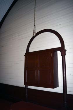 As described in the San Diego Union of that period, the temple measured 56 x 30 feet, with two small rooms on either side of its entrance. Over the years, those rooms had such uses as an office for the clergy and a changing room for a bride. The walls of the sanctuary were painted gray, the ceiling sky blue, and 250 numbered chairs faced the Holy Ark (Aron Kodesh) carved from sugar pine with redwood panels, with an eternal light (Ner Tamid) suspended from the ceiling. The aisles were carpeted with cocoa and plain matting. A chandelier hung from the ceiling at the center of the room.
