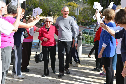 Passenger Anna Ritter and volunteer driver Howard Kugler are welcomed by an enthusiastic crowd at JFS's College Avenue Center