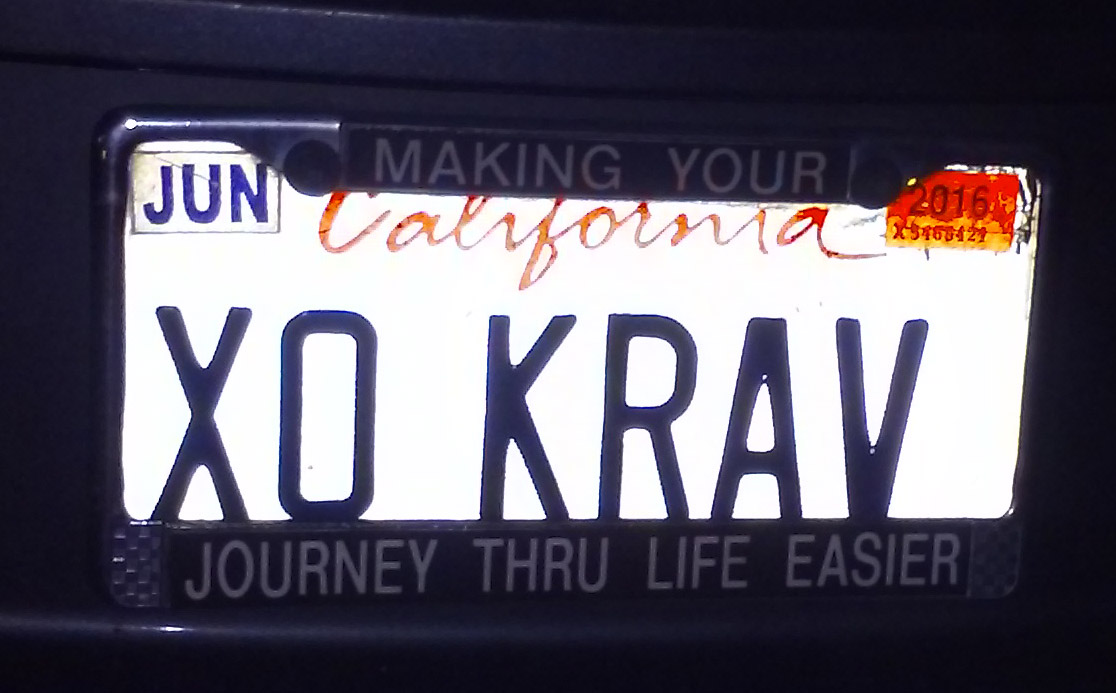 SAN DIEGO–License plate maven Melanie Rubin found this combination of the popular X and O abbreviations for kisses and hugs, and the Hebrew word “Krav” for battle. So together they suggest “battling” with kisses and hugs. According to the license plate frame, this is a prescription for “making your journey thru life easier.”