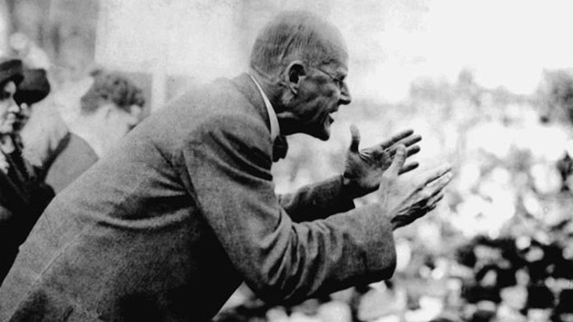 Debs was born in Terra Haute, Indiana in 1855 to a solidly middle-class family; his father owned a grocery store. While still a teenager, he left school and began working on the railroad. He joined the Brotherhood of Locomotive Firemen, and later was instrumental in the founding of the American Railway Union (ARU). In 1894 when the Pullman Palace Car Co. decided to decrease their workers’ wages, the workers went on strike. The ARU decided to boycott handling all Pullman cars. This strike was broken up by the U.S. Army and as a leader of the ARU, Debs was convicted of defying a court injuction and jailed for six months. In prison he read a lot, became a socialist, and spent much of the time talking to and considering the needs of his fellow inmates. Debs was very popular in prison.