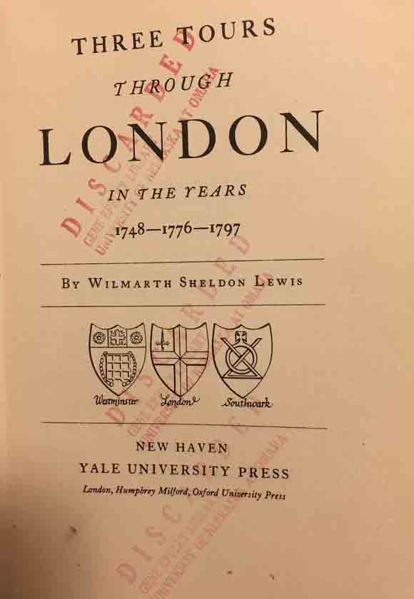 Three Tours Through London in the Years 1748, 1776 and 1797 by Wilmarth Sheldon Lewis, is the 21st volume in the Brown University Colver Lectures inaugurated in 1916, and still going. It was published by Yale University Press in 1941. Lewis, born in Alameda, California, and a Yale scholar, amassed the largest Horace Walpole collection. In 1941 the book symbolized American academic support for beleaguered London under fire. Lewis also had sage advice, “Tourists are not expected to see everything.”