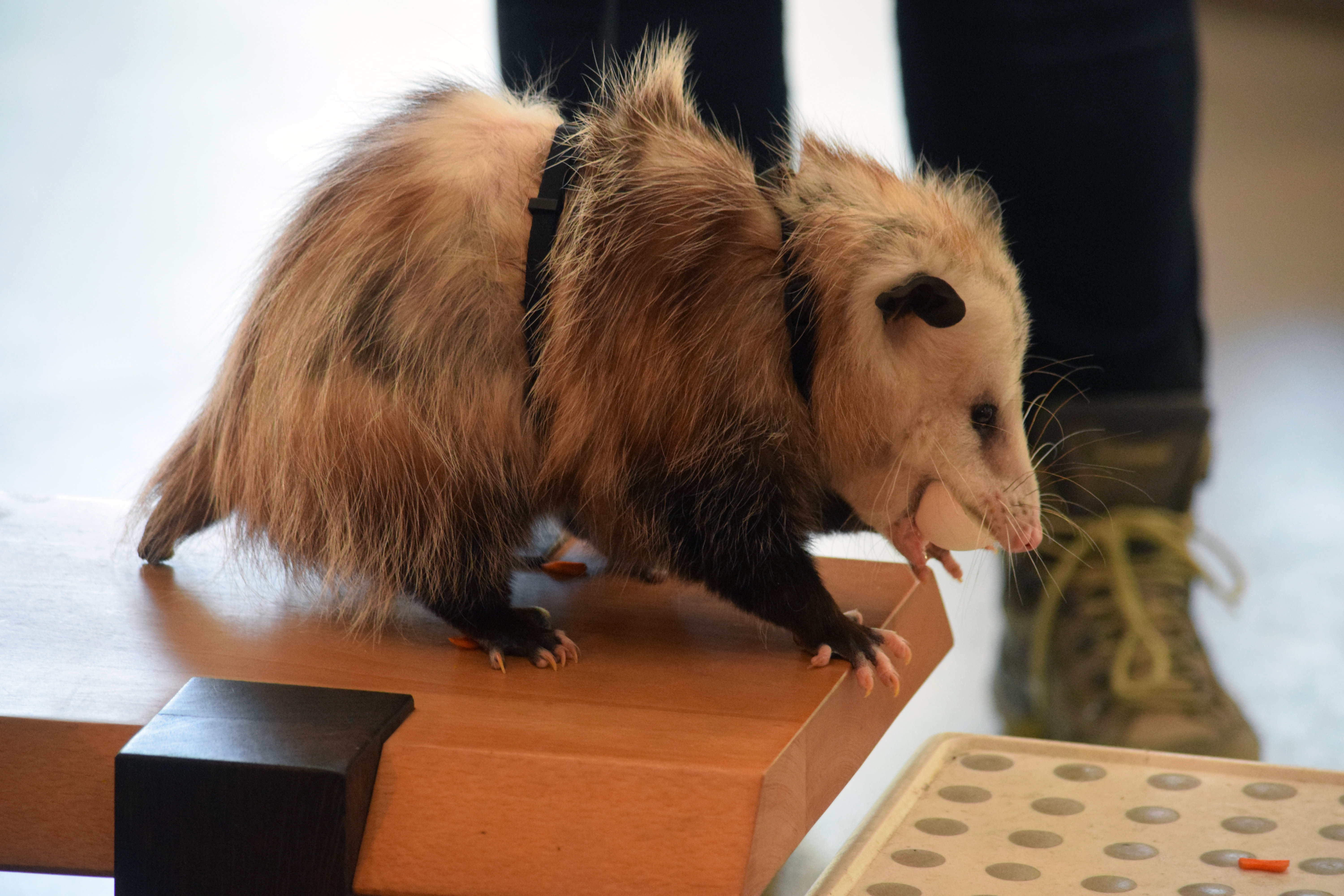 Food treats such as rat’s tails, pieces of dead mice, slices of various fruits and vegetables, were laid out on an obstacle course that had as its “grand prize” a hard-boiled egg. Poppy worked her way along the course, eating every dollop of food she encountered as educator Joshua Armosino shared with us and a score of other visitors some facts about opossums.