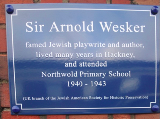 The Wesker plaque is an effort of the U.K. Branch of the Jewish American Society for Historic Preservation, chaired by noted British Historian and Educator Martin Sugarman. The plaque is on an outside wall of the Northwold Primary School Wesker attended.