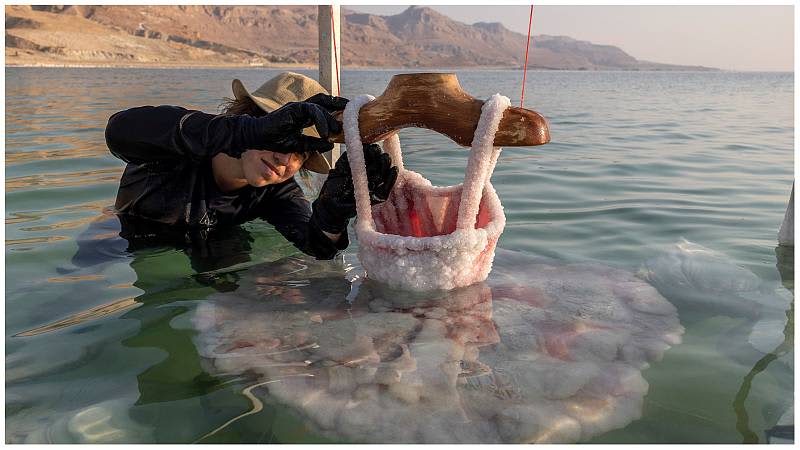 Israeli artist Sigalit Landau wades into the warm, briny waters of the Dead Sea to inspect her latest creations — everyday objects coated in salt crystals that glisten in the bright morning sun. The lowest point on Earth is also Landau’s studio where she submerges objects — from a ballet dress to a lampshade’s wire frame — for weeks until they are magically transformed by ice-like layers of salt. Landau works by suspending the objects in the salt lake from frames. Later, she carefully liberates the brittle artefacts with the help of several assistants. Some objects are so heavy with the sal…
