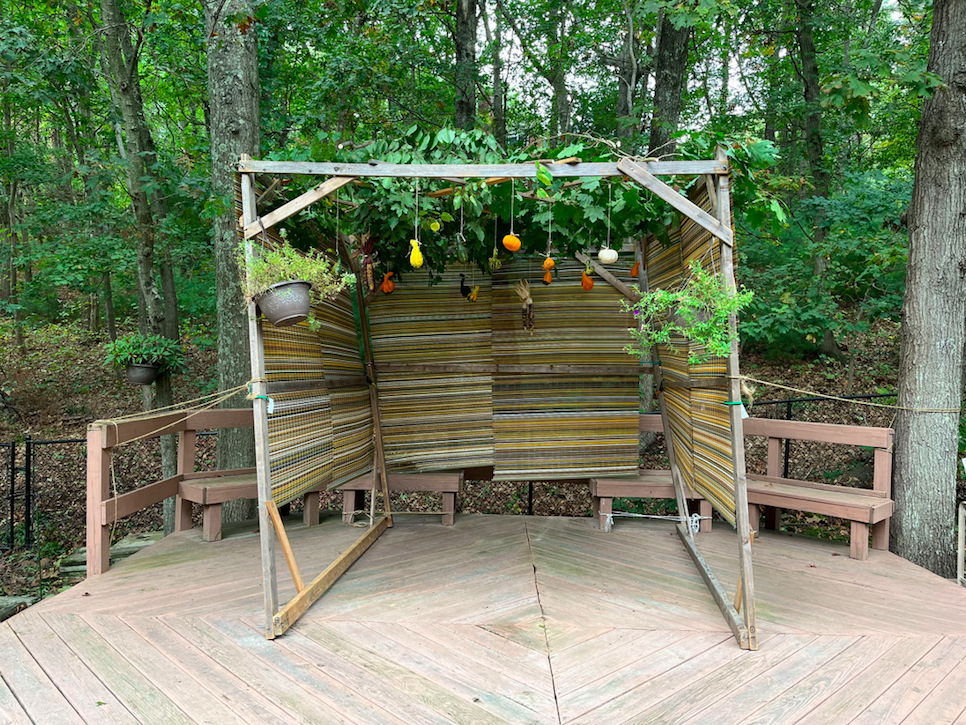 Jews around the world are celebrating Sukkot this week. The most significant preparation is the building of a sukkah, a temporary outdoor structure, by many synagogues, schools, Jewish organizations, and individuals. The sukkah symbolizes the huts in which the Israelites lived during the Exodus, and also represents the structures that farmers lived in near their fields at harvest time. Many people decorate their sukkahs with items such as drawings by their children, colorful gourds, lights, or flowers. Which of the following is an example of a sukkah which had symbolic decorations?