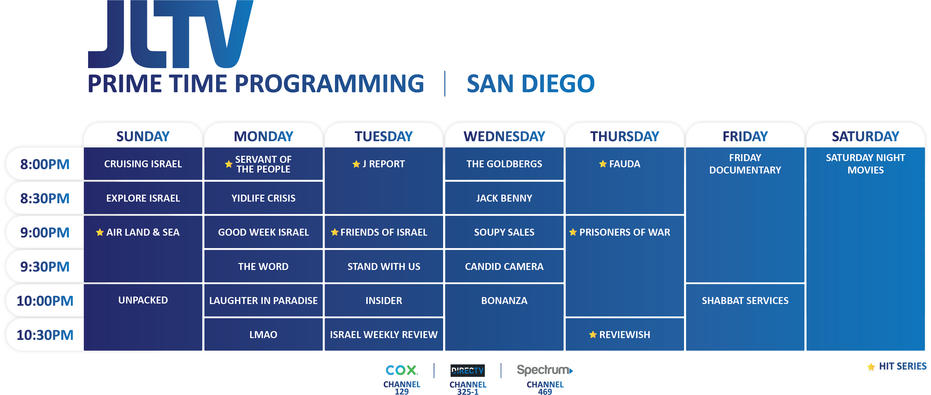 SAN DIEGO – Jewish Life TV is penetrating the San Diego market with 24-hour programming on three services: Cox Cable Channel 129; Spectrum TV Channel 469, and Direct TV Channel 325-1.