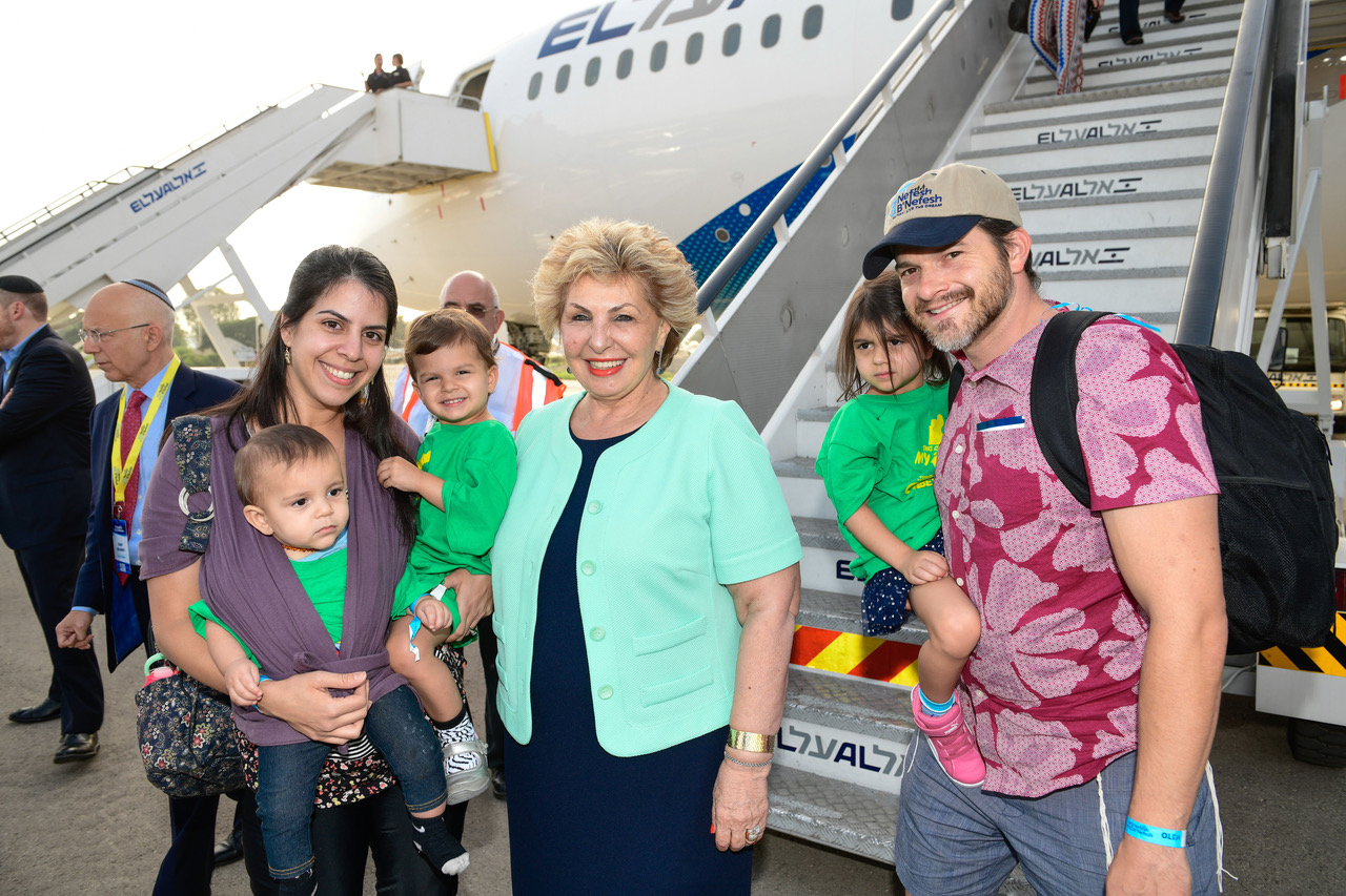Minister of Aliyah and Integration, Sofa Landver poses with the Leopold family from Las Vegas following their Aliyah charter flight with Nefesh B’Nefesh (Photo: Shahar Azran)