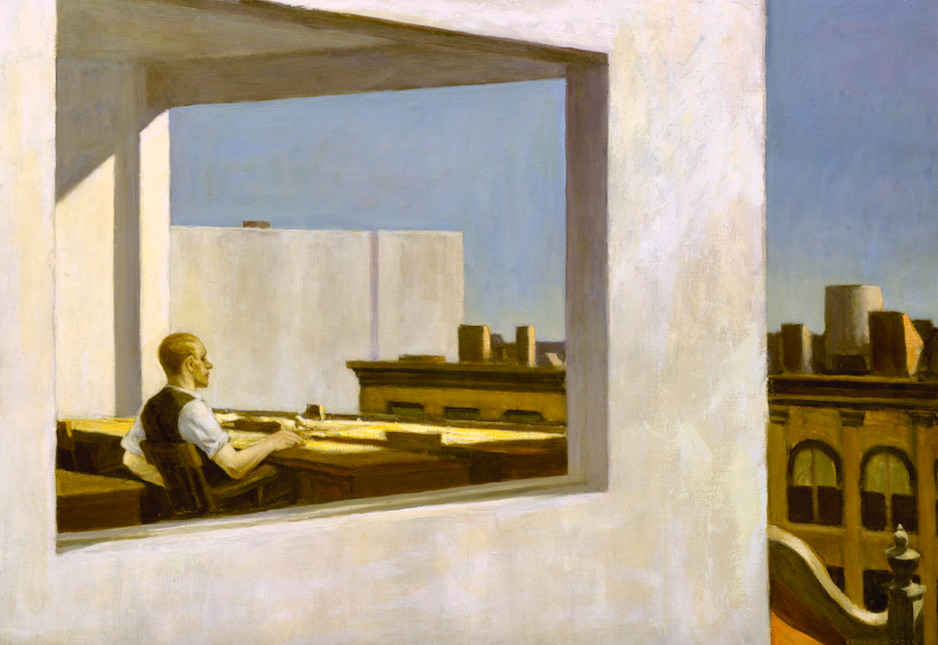 Office in a Small City (1953) is a case in point. The painting uses simple forms to convey the diminution of the individual in modern life. It is no accident that the title makes mention of the office (bathed in light), but none of the man who sits within its purely utilitarian, bone-white concrete slabs. In fact, he is not an individual at all, but with his white rolled-up sleeves, he is as undistinctive and functional as the room he inhabits. The militantly unadorned building towers over some old brownstones; and the juxtaposition is made more brutal, even violent, by the corner of the office building that stretches the entire height of the painting, literally dividing the older buildings in the background. In this case, the sheer verticality of the building is a kind of counterpoint to the insignificance of the man installed within that space.