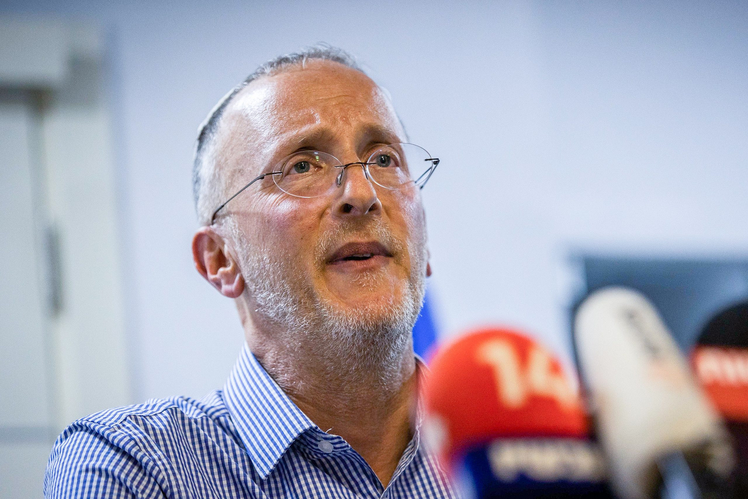 British Israeli Rabbi Leo Dee, who in the span of three days lost two daughters, Maia and Rina, and his wife, Lucy, in a terrorist car attack, holds a press conference in Efrat on April 10, 2023. Photo by Oren Ben Hakoon/Flash90.