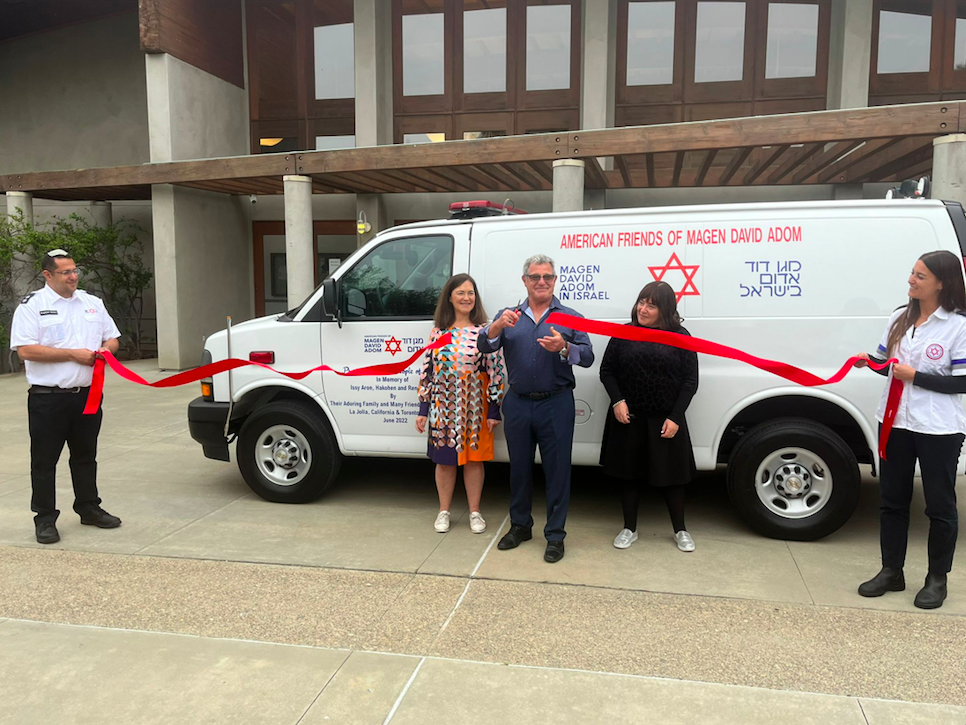 Mike Aron, Karen Aron, and fellow members of the local Jewish community gathered at Congregation Adat Yeshurun in La Jolla for the dedication of an ambulance that they donated to Magen David Adom (MDA) — Israel’s national emergency medical, disaster, ambulance, and blood bank service — in honor of Mike’s late father, Yitzchak Ben Zuzman-HaKohein.
