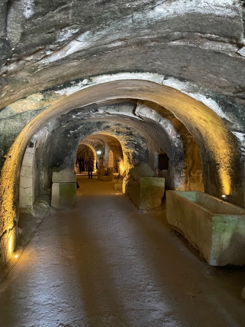 In Bet She’arim we toured the huge necropolis dating back to the first three centuries of the Common Era. This site is now a national park. The soft chalk limestone in the area was excavated as needed by wealthy families who had many ancestors buried close together. There were also smaller rock-cut tombs for less substantial families. The bodies were placed in coffins. A year later, their bones were retrieved (that was all that remained) and placed in an ossuary, which could hold many remains. The necropolis was destroyed and abandoned after a huge earthquake in 363 CE.