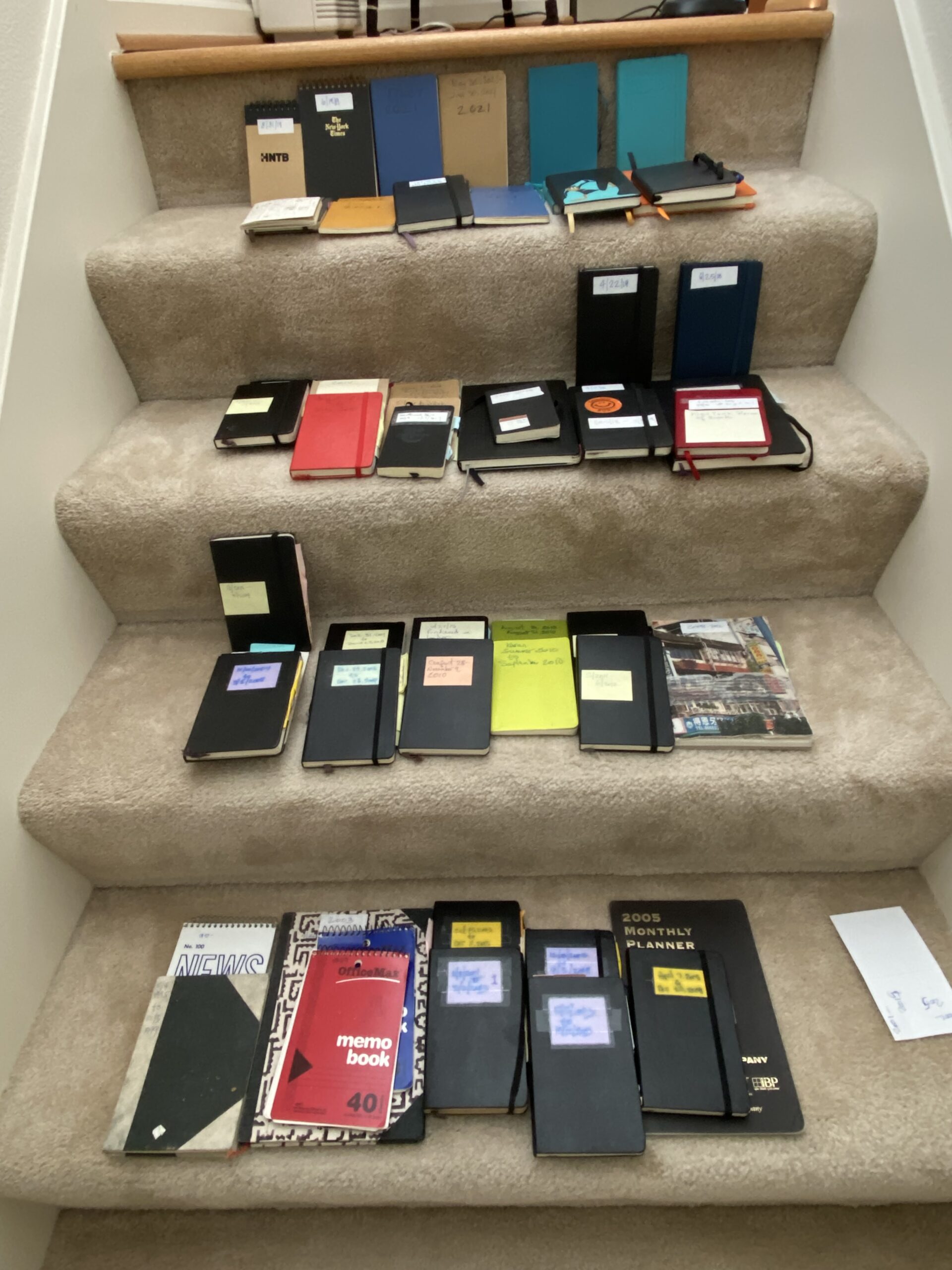 Stung by Bruce Chatwin and Moleskines my notebooks cover 1995 to 2023, pebbles compared to Ash’s boulder.