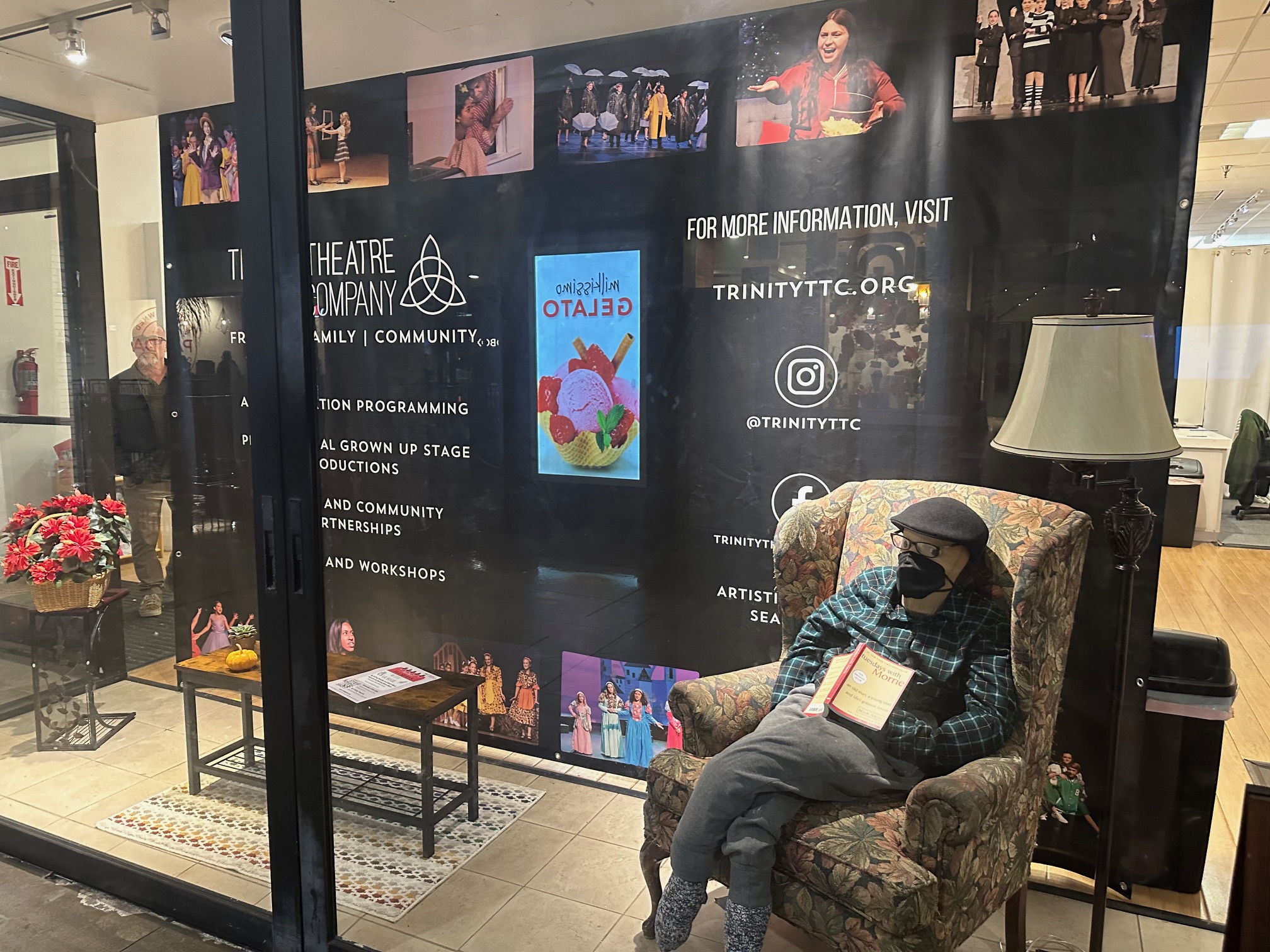 Storefront display at the Trinity Theatre Company for “Tuesdays with Morrie” (SDJW photo)