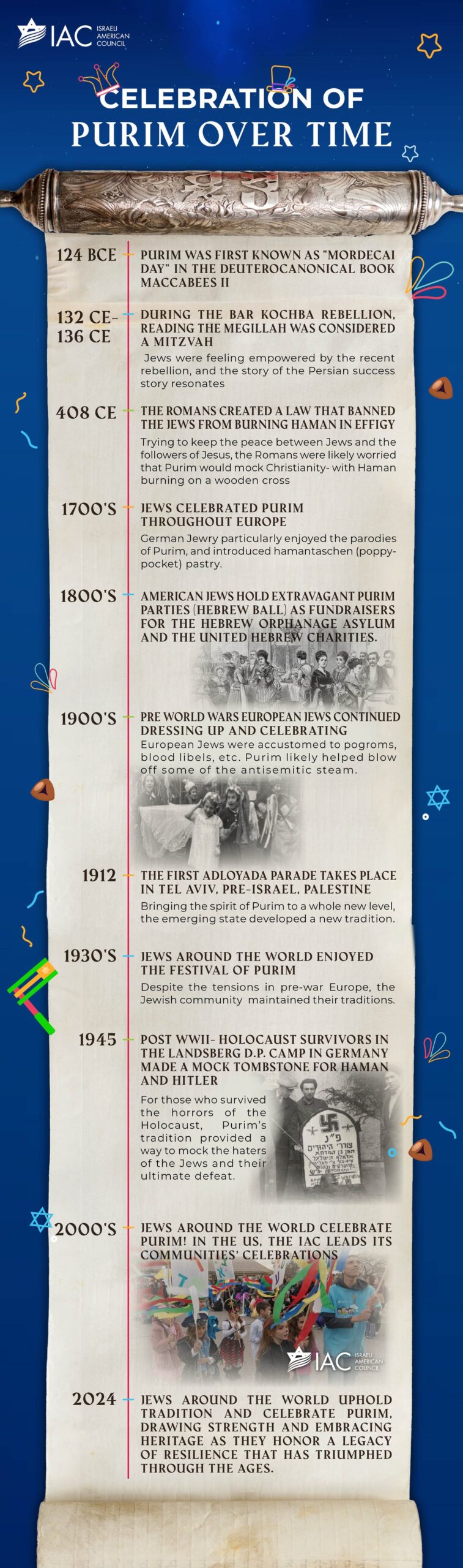 The Israeli-American Council has circulated the adjacent timeline detailing how Purim has been celebrated over the centuries.