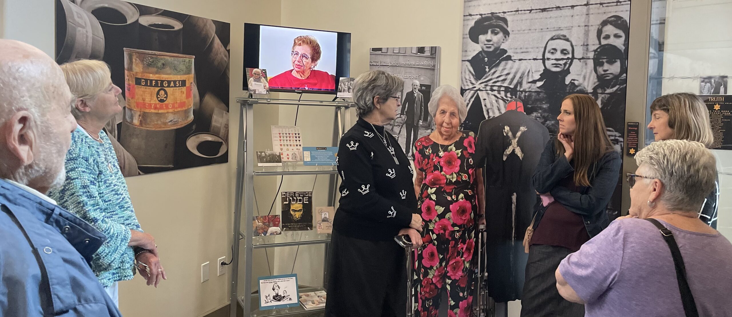 Curator Sandra Scheller talked about how her mother, Ruth Goldschmiedova Sax, had survived the Holocaust, and told of how she put together this exhibit in honor of her mother and other survivors who made their lives in San Diego County.