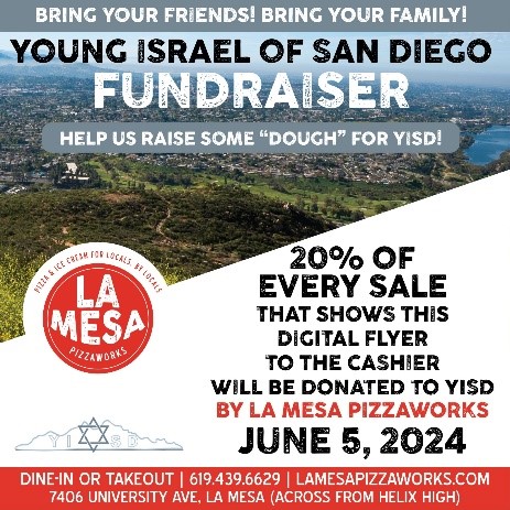 In my young adult/parenting life, I do not think I have met a person who does not like pizza. I think it is a staple at every kid’s birthday party and even adult birthday parties. The other night, I saw it at the Chinese buffet, and we laughed since our twins were so excited to see pizza was available. Did you know that La Mesa has a kosher pizza location? My family was one of the first customers as it is within walking distance from our home. My twins have said it is the best pizza ever. Please join Young Israel of San Diego’s Fundraiser on June 5 with the adjacent 20% off coupon and enjoy the night supporting a good cause.