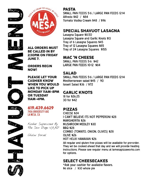 La Mesa Pizza Works owner, Sarah Piha posted a special kosher catering menu on Facebook for Shavuot. All orders must be called in by 2:30 p.m., Friday, June 7 and picked up on Monday, June 10 or Tuesday, June 11. They will be closed for Shavuot. Adjacent is the holiday menu.