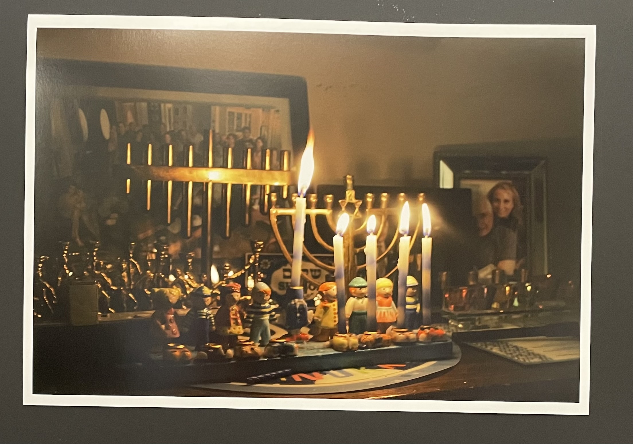 As the kids were getting restless to move on, I came across this image in the photography section of the fourth night of Chanukah. The photo was taken by Poway High School student, Sierra Marshall. As I studied the picture, I saw a few unlit chanukiahs in the background and what might have been photos of the student’s Bubbe and Zayde (grandparents).