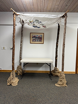 Two Torahs saved from the Holocaust were obtained, one from the Czech Republic; the other from Hungary. A congregant whose hobby is woodworking built the Holy Ark within which to keep them. Another congregant created a rustic chuppah. Jewish books were donated to the congregational library. Temple Sukkat Shalom (Shelter of Peace) is small, yet compact.