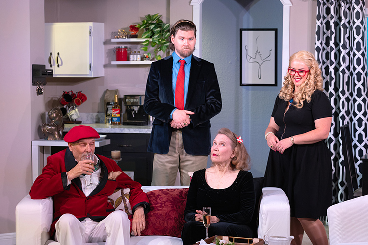 David (Josh Click) and Barbara (Christy Reid) (Bobsy to her Mama) are art dealers, living the good life in Manhattan. Their comfortable and perhaps indulgent lifestyle is flowing along smoothly between gallery openings and entertaining famous artists until Trudy (Kelley Goode) and Martin (Tim Arends), Barbara’s sister and brother-in-law, throw a major wrench into the works. The Mineola, Long Island, couple has recently become almost empty nesters after Sarah, their daughter, has gone off to college. Struggling with seeing their young daughter as a quasi-adult, they insist on intruding into her newly found independence and cramping her style as she enjoys her foray into the world of sexual freedom. This evokes more than a smidgen of parental concern.